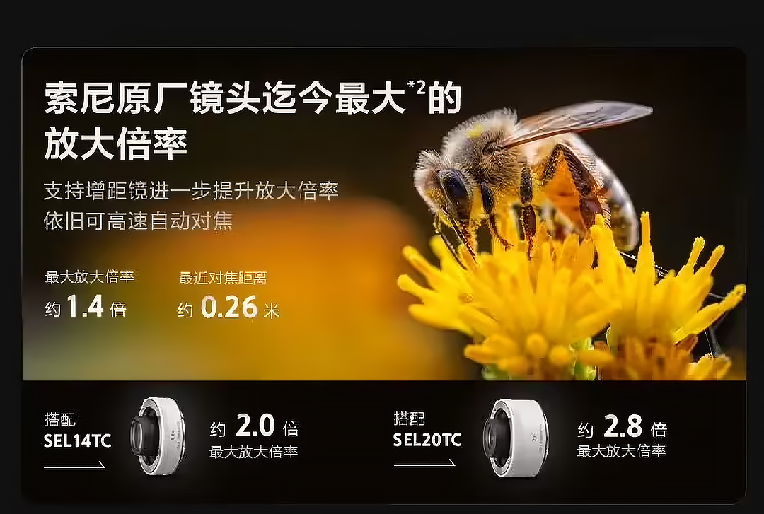 该镜头支持搭配 SEL14TC 及 SEL20TC 两款增距镜(需另购)使用,实现最大约 2.8 倍的放大倍率,可以在拍摄易被惊扰、不易接近的被摄主体时,保持舒适的拍摄距离,同时拍摄细节丰富、高质感的微距特写画面。搭配 Alpha 1 II、Alpha 7R V 等高像素机型拍摄时,可提供更加令人惊叹、见所未见的拍摄细节。